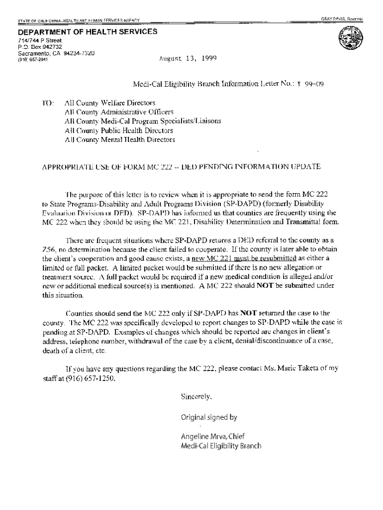 GRAY DAVIS, Governorate OF CALIFORNIAHEALTH AND HUMAN SERVICES AGENCYDEPARTMENT OF HEALTH SERVICES 714/744 P Street P.O. Box 942732 Sacramento, CA 942347320 (916) 6572941August 13, 1999MediCal Eligibility