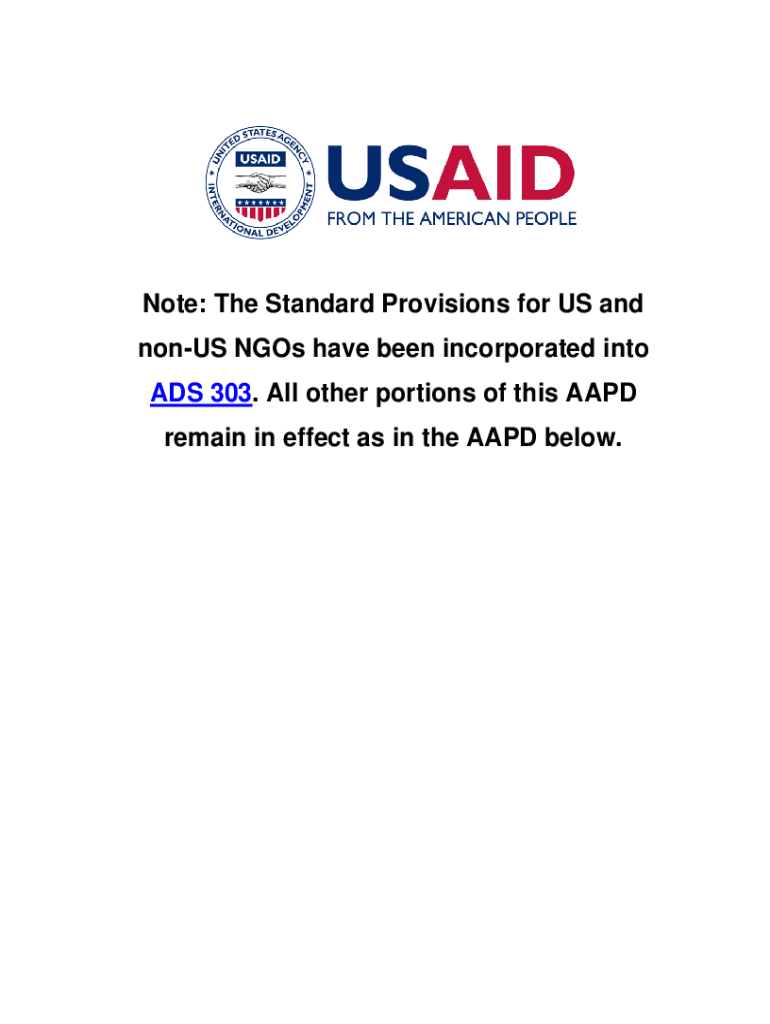 Note: The Standard Provisions for US and bonus NGOs have been incorporated into ADS 303. All other portions of this LAPD remain in effect as in the LAPD below. Acquisition & Assistance Policy Directive