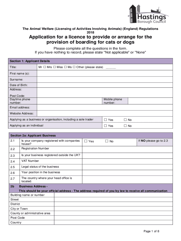 The Animal Welfare (Licensing of Activities Involving Animals) (England) Regulations 2018Application for a license to provide or arrange for the provision of boarding for cats or dogs Please complete