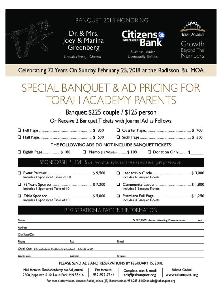 BANQUET 2018 HONORING Dr. & Mrs. Joey & Marina GreenbergBusiness Leader. Community Builder. Growth Through ChesedCelebrating 73 Years On Sunday, February 25, 2018, at the Radisson Blu SPECIAL BANQUET