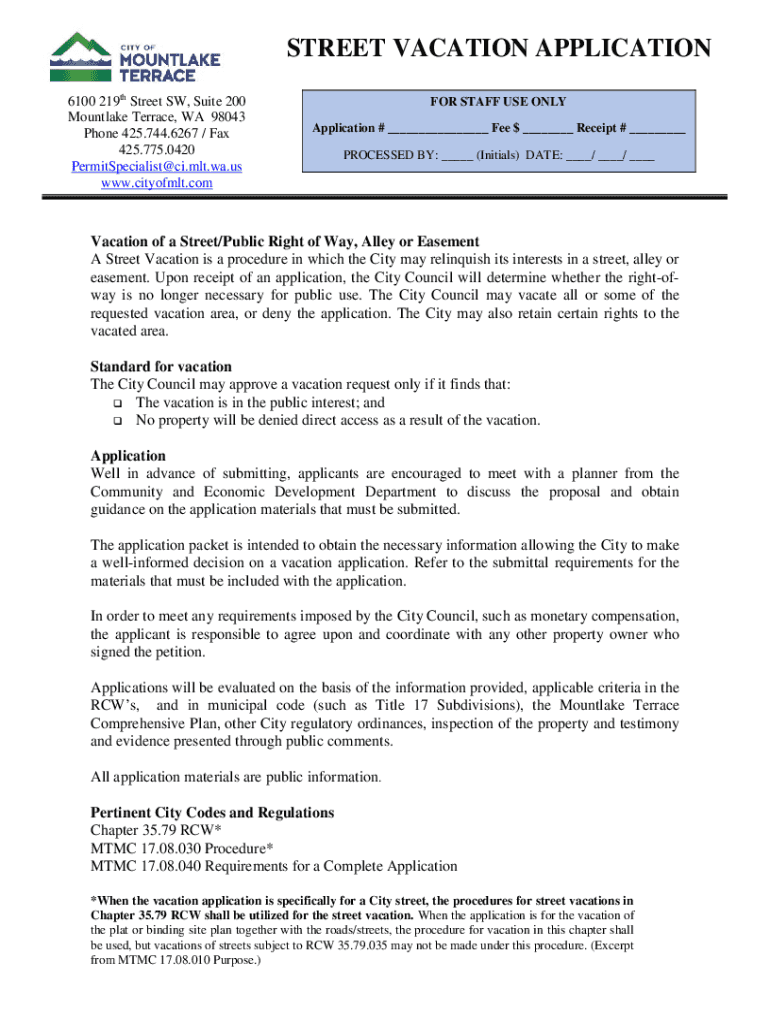 STREET VACATION APPLICATION 6100 219th Street SW, Suite 200 Mount lake Terrace, WA 98043 Phone 425.744.6267 / Fax 425.775.0420 PermitSpecialist@ci.mlt.wa.us www.cityofmlt.comFOR STAFF USE ONLY Application