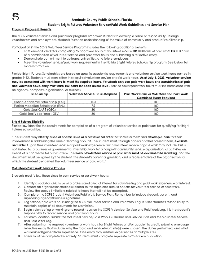 Seminole County Public Schools, Florida Student Bright Futures Volunteer Service/Paid Work Guidelines and Service Pre-program Purpose & Benefits SCPs volunteer service and paid work programs empower