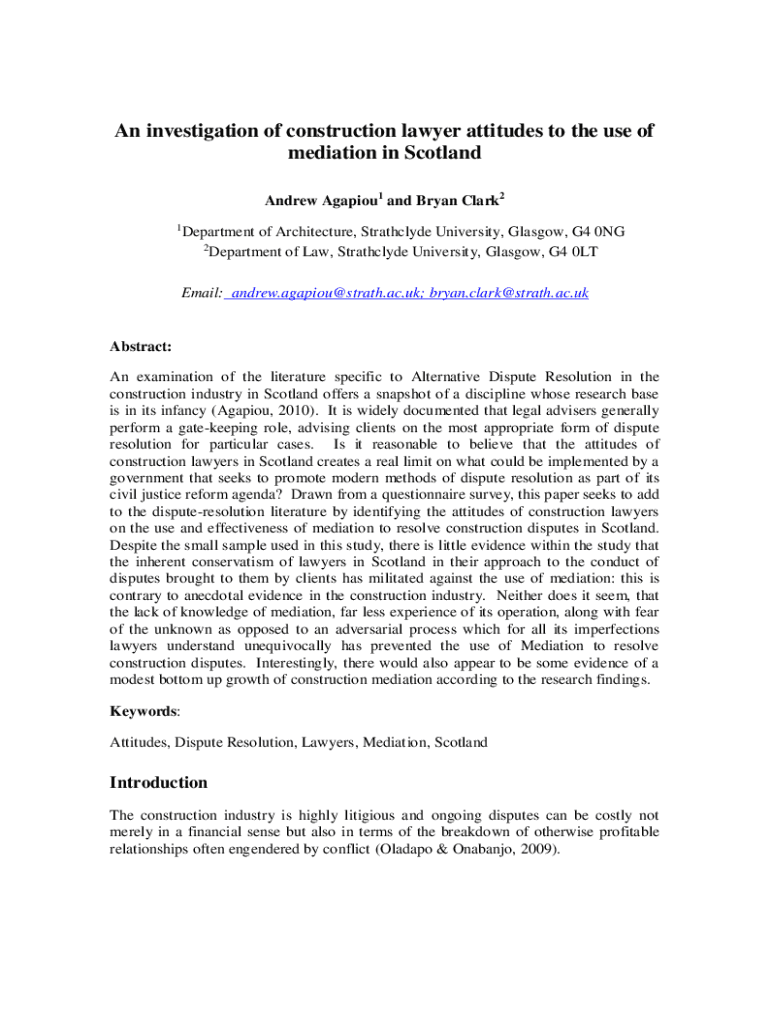 An investigation of construction lawyer attitudes to the use of mediation in Scotland Andrew Agapiou1 and Bryan Clark2 1Department of Architecture, Strathclyde University, Glasgow, G4 0NG 2 Department