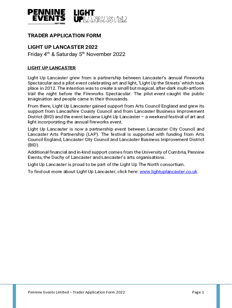 TRADER APPLICATION FORM LIGHT UP LANCASTER 2022 Friday 4th & Saturday 5th November 2022 LIGHT UP LANCASTER Light Up Lancaster grew from a partnership between Lancaster's annual Fireworks Spectacular