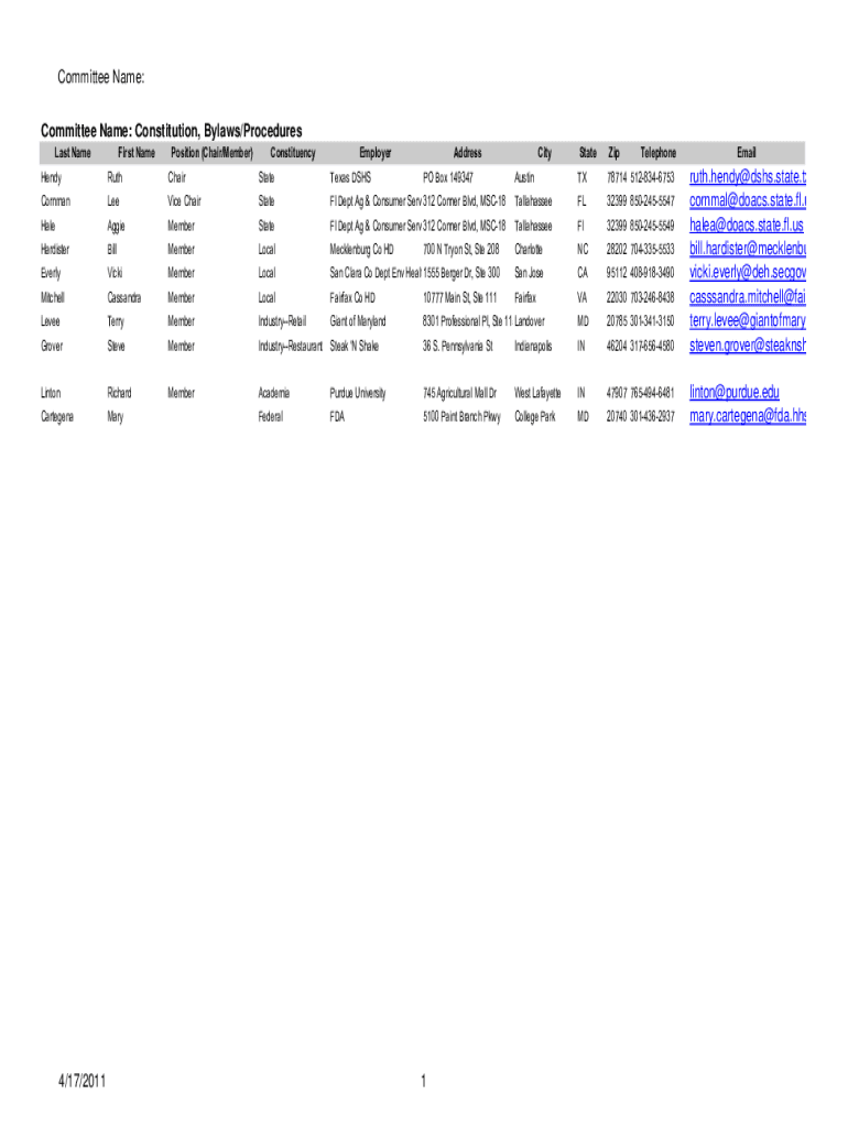 Committee Name: Committee Name: Constitution, Bylaws/Procedures Last NameFirst Composition (Chair/Member)ConstituencyEmployerStateZipTX78714 5128346753Fl Dept Ag & Consumer Services 312 Conner Blvd,