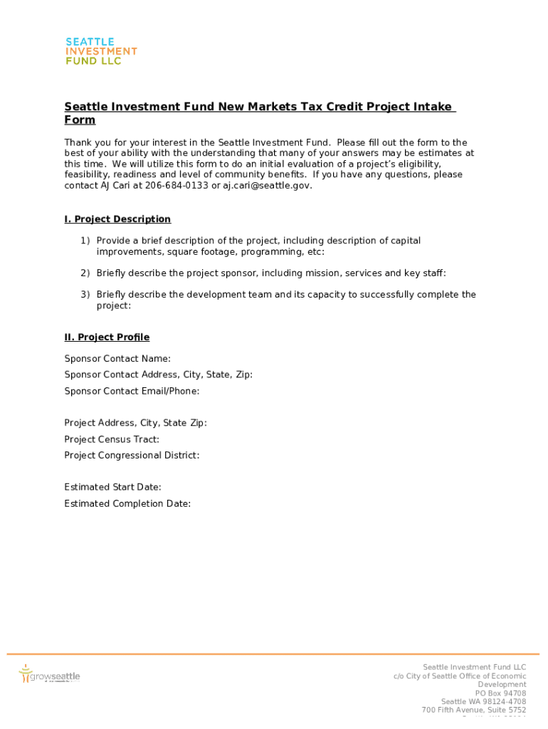 The New Markets Tax Credit Intake is a writable document that has to be filled-out and signed for certain purposes. Then, it is furnished to the relevant addressee in order to provide certain info of certain kinds. The completion and signing may be done manually or via a suitable tool e. g. PDFfiller. These services help to fill out any PDF or Word file without printing them out. While doing that, you can customize it depending on the needs you have and put an official legal digital signature. Once done, the user sends the New Markets Tax Credit Intake to the respective recipient or several recipients by mail or fax. PDFfiller includes a feature and options that make your template printable. It includes different options for printing out appearance. It does no matter how you will send a form - physically or electronically - it will always look professional and organized. In order not to create a new file from scratch again and again, make the original file into a template. After that, you will have a customizable sample.