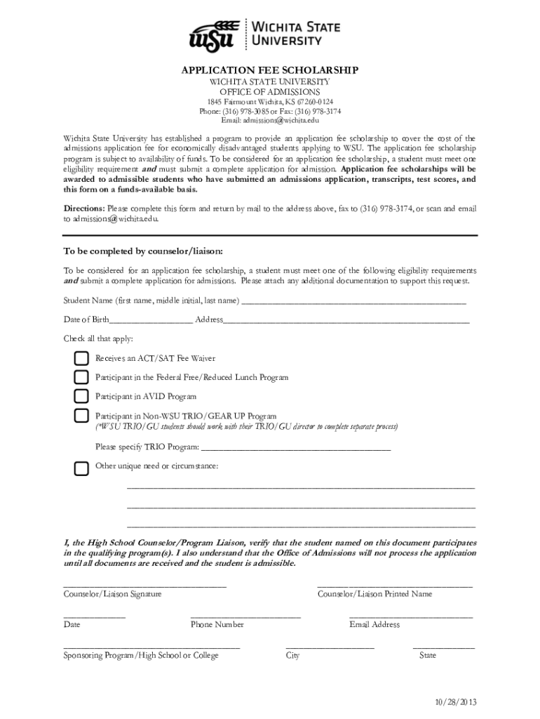APPLICATION FEE SCHOLARSHIP WICHITA STATE UNIVERSITY OFFICE OF ADMISSIONS1845 Fairmount Wichita, KS 672600124 Phone: (316) 9783085 or Fax: (316) 9783174 Email: admissions@wichita.eduWichita State