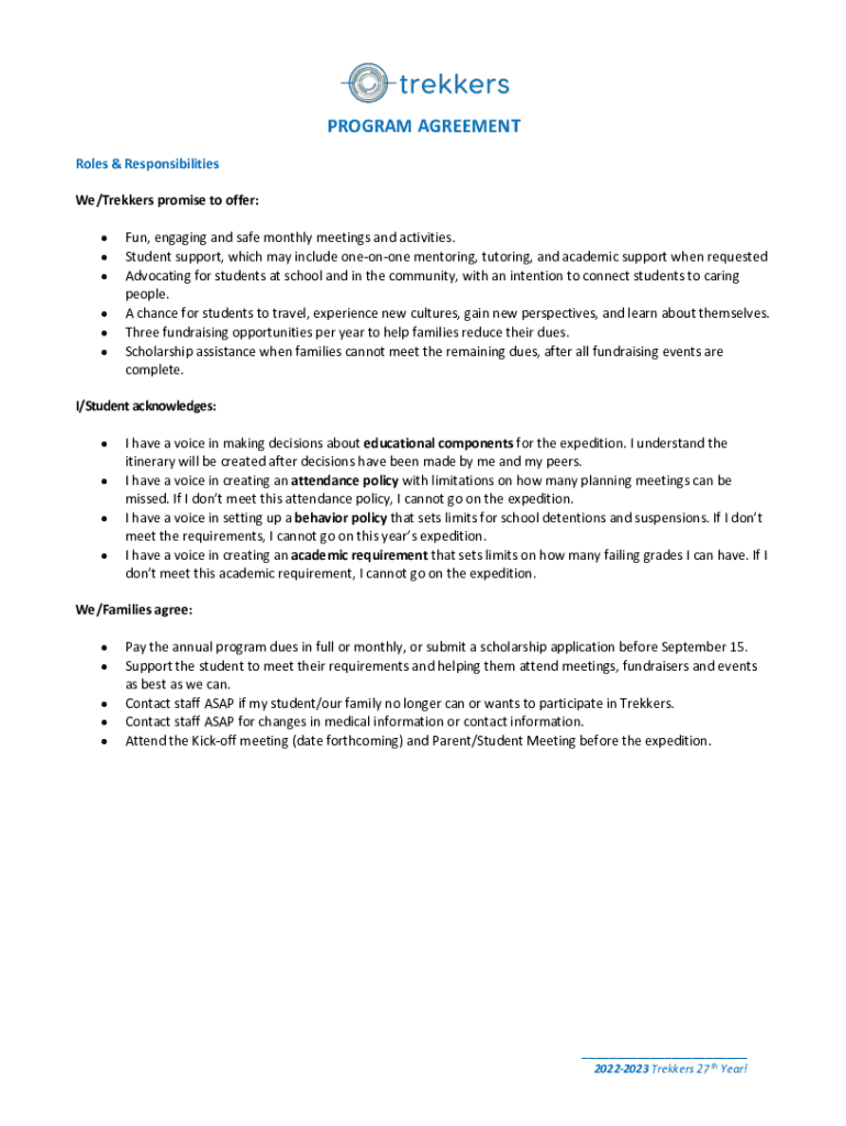 PROGRAM AGREEMENT Roles & Responsibilities We/Trekkers promise to offer: Fun, engaging and safe monthly meetings and activities. Student support, which may include OneNote mentoring, tutoring, and