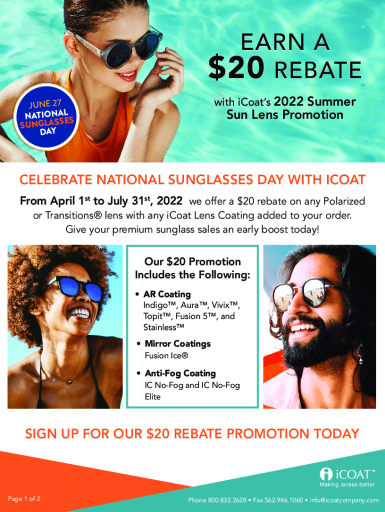 EARN A $20 REBATE with coats 2022 Summer 27 NATIONALS SUN GLA SS DAY Sun Lens PromotionCELEBRATE NATIONAL SUNGLASSES DAY WITH COAT From April 1st to July 31st, 2022 we offer a $20 rebate on any Polarized