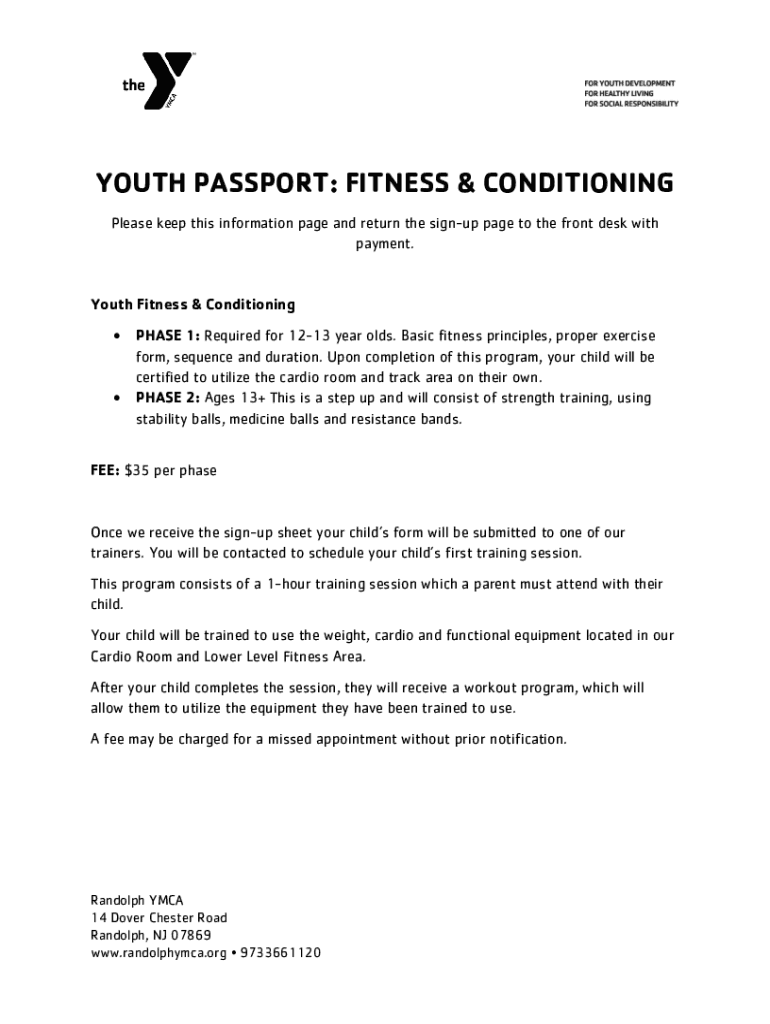 YOUTH PASSPORT: FITNESS & CONDITIONING Please keep this information page and return the sign-up page to the front desk with payment. Youth Fitness & Conditioning PHASE 1: Required for 1213-year-olds.