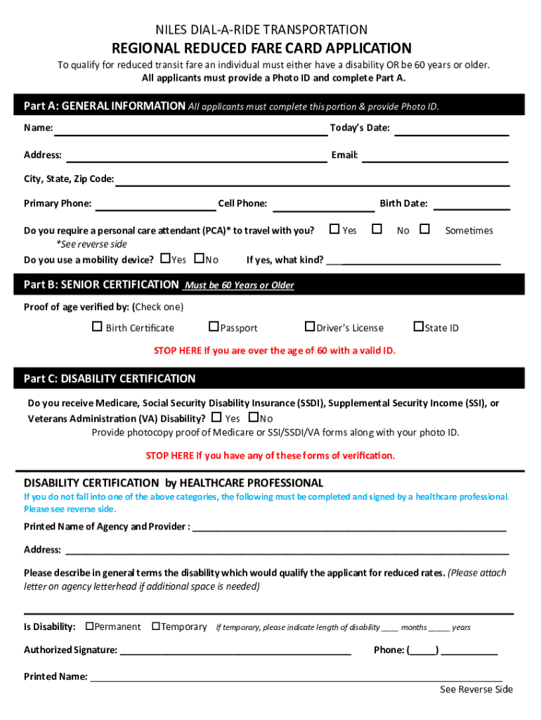 MILES DILLARD TRANSPORTATIONREGIONAL REDUCED FARE CARD APPLICATION To qualify for reduced transit fare an individual must either have a disability OR be 60 years or older. All applicants must provide