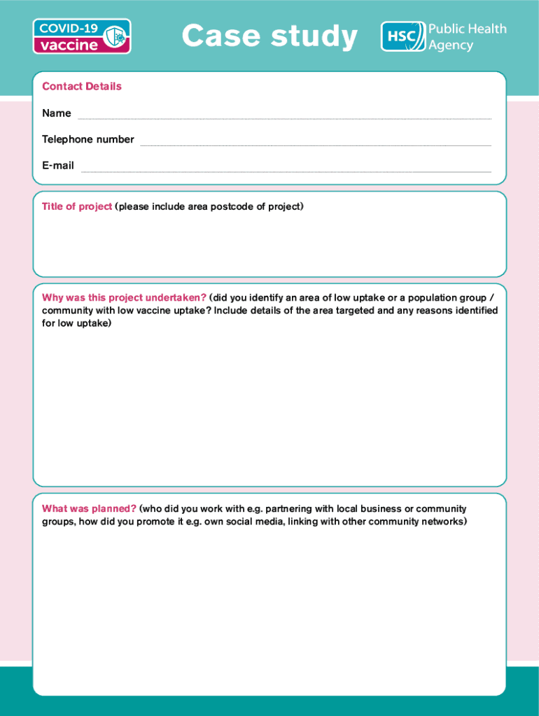 Case study Contact Details NameTelephone number Mistitle of project (please include area postcode of project)Why was this project undertaken? (did you identify an area of low uptake or a population