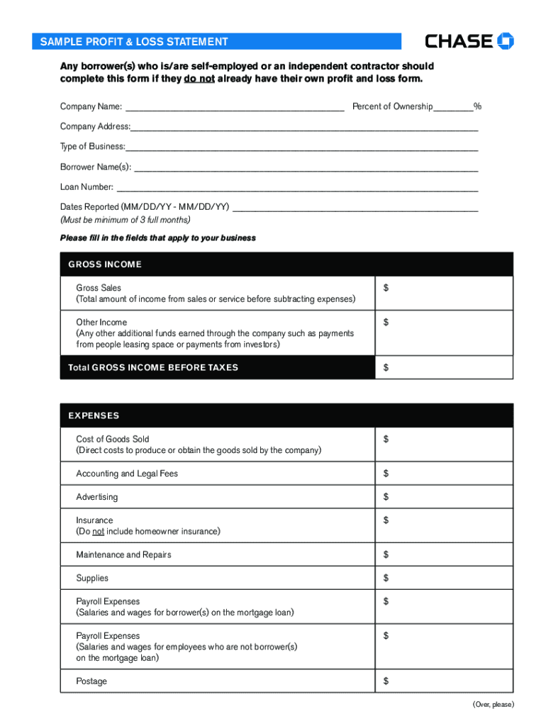 SAMPLE PROFIT & LOSS STATEMENT Any borrower(s) who is/are self employed or an independent contractor should complete this form if they do not already have their own profit and loss form. Company Name: