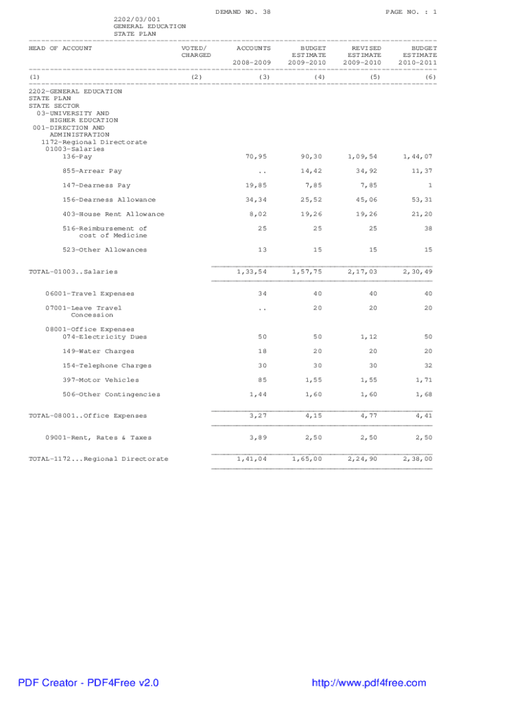 DEMAND NO. 38-PAGE NO. 1 2202/03/001 GENERAL EDUCATION STATE PLAN HEAD OF ACCOUNT VOTED/ ACCOUNTS BUDGET REVISED BUDGET CHARGED ESTIMATE ESTIMATE ESTIMATE 20082009 20092010 20092010 20102011 (1)