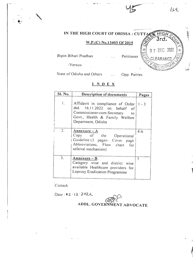 Is 4IN THE HIGH COURT OF ORI SSA : CUTTACK! G^^iiW. P.(CI No.13403 Of 2015f; 5Bipin Bihar Pradhan... Pemioner1?ARP 0 ? DEC 2022 VwVersusSv ^ state of Odisha and Others0pp. Parties N D E X SI. No.