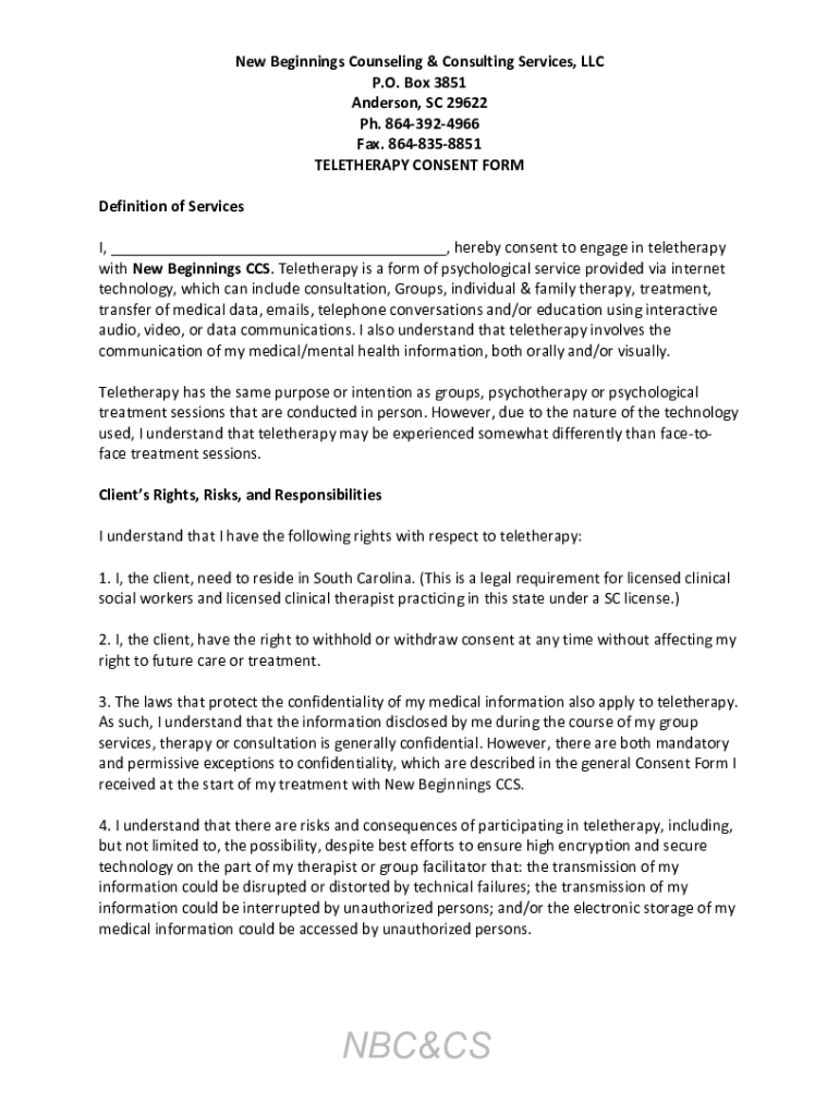 New Beginnings Counseling & Consulting Services, LLC P.O. Box 3851 Anderson, SC 29622 pH. 8643924966 Fax. 8648358851 TELETHERAPY CONSENT FORM Definition of Services I, ___, hereby consent to engage