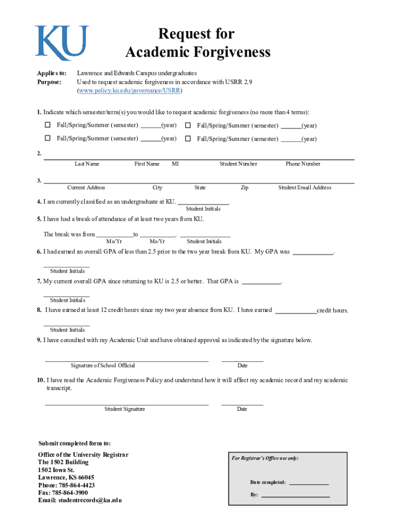 Request for Academic Forgiveness Applies to: Purpose:Lawrence and Edwards Campus undergraduates Used to request academic forgiveness in accordance with USER 2.9 (www.policy.ku.edu/governance/USRR)1.