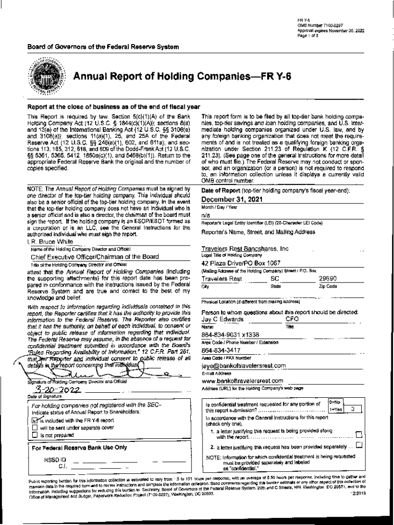 FRY6 0 MB Number 71000297 Approval expires November 30, 2022-Page 1 of2Board of Governors of the Federal Reserve System, i, \'c\'o..... Annual Report of Holding Companies FR Y6Report at the close