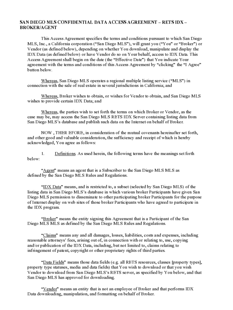 SAN DIEGO MLS CONFIDENTIAL DATA ACCESS AGREEMENT GETS ID BROKER/AGENT This Access Agreement specifies the terms and conditions pursuant to which San Diego MLS, Inc., a California corporation (San