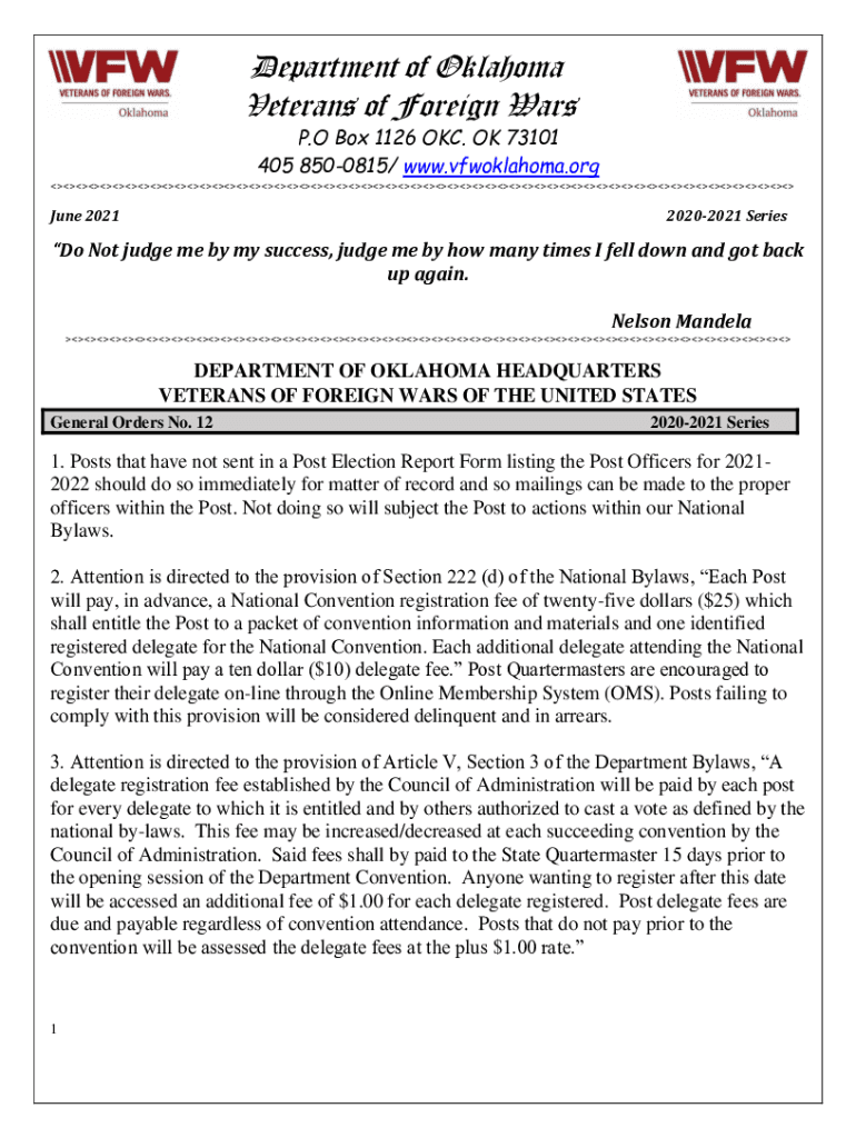 Department of Oklahoma Veterans of Foreign Wars P. O Box 1126 OK. OK 73101 405 8500815/ www.vfwoklahoma.org June 202120202021 Series Not judge me by my success, judge me by how many times I fell down
