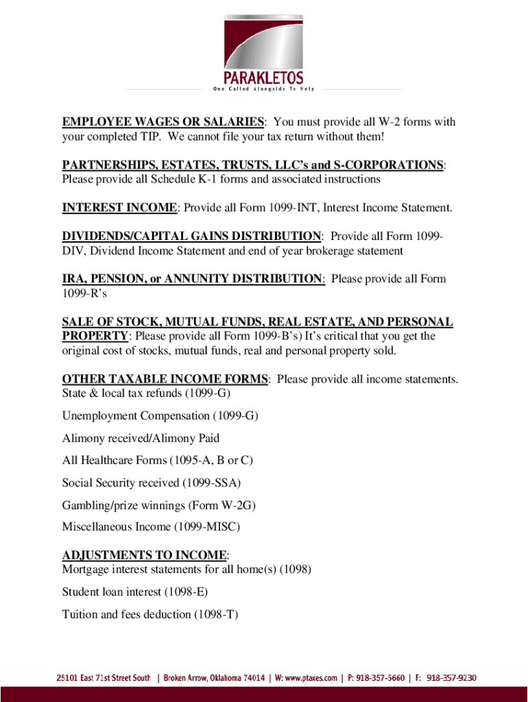 EMPLOYEE WAGES OR SALARIES: You must provide all W2 forms with your completed TIP. We cannot file your tax return without them! PARTNERSHIPS, ESTATES, TRUSTS, LCS and CORPORATIONS: Please provide