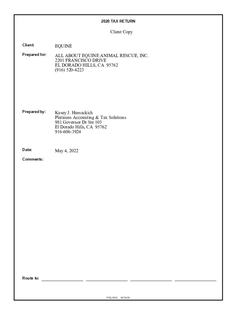 2020 TAX RETURNClient Copy Client:EQUINEPrepared for:ALL ABOUT EQUINE ANIMAL RESCUE, INC. 2201 FRANCISCO DRIVE EL DORADO HILLS, CA 95762 (916) 5204223Prepared by:Kasey J. Humankind Platinum Accounting