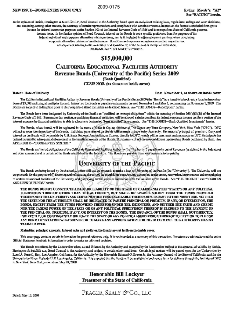 20090175NEW ISSUEBOOKENTRY FORM Operating: Moody\'s: \”Al\” See \”RATING\” herein. In the opinion of Or rick, Herrington & Ratcliffe LLP, Bond Counsel to the Authority, based upon an analysis