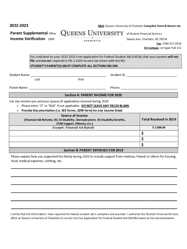 20222023Mail: Queen's University of Charlotte Complete Form & Return via:Parent Supplemental Office Income Verification 1900of Student Financial Services Selwyn Ave. Charlotte, NC 28274 Fax: (704)