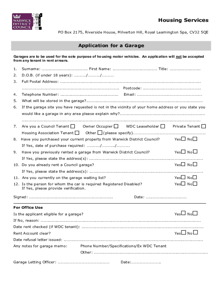 Housing Services PO Box 2175, Riverside House, Silverton Hill, Royal Lexington Spa, CV32 5QEApplication for a Garage Garages are to be used for the sole purpose of housing motor vehicles. An application
