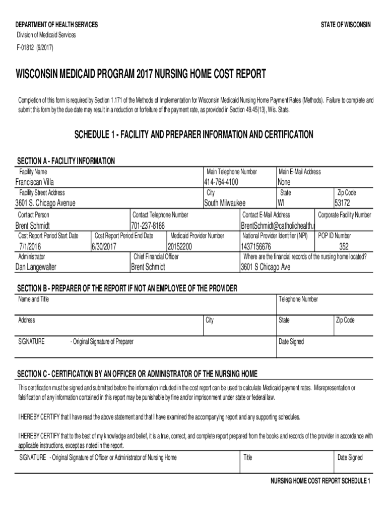 DEPARTMENT OF HEALTH SERVICES Division of Medicaid ServicesSTATE OF WISCONSINF01812 (9/2017)WISCONSIN MEDICAID PROGRAM 2017 NURSING HOME COST REPORT Completion of this form is required by Section