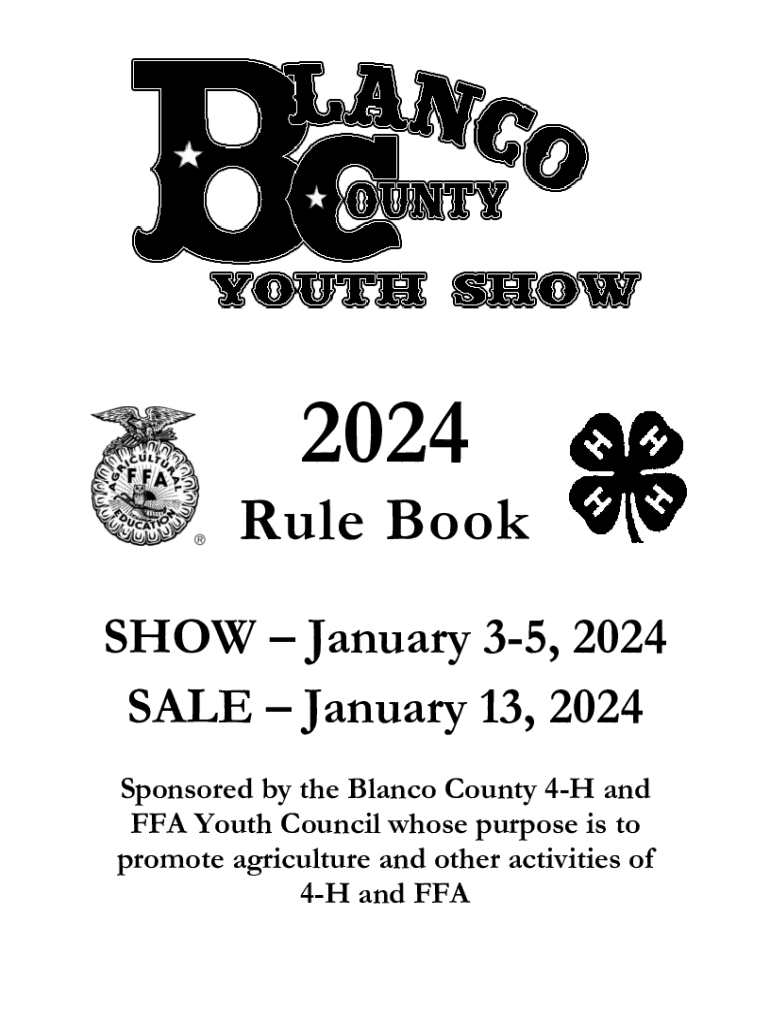 2024 Rule Book SHOW January 35, 2024 SALE January 13, 2024 Sponsored by the Blanco County 4H and FFA Youth Council whose purpose is to promote agriculture and other activities of 4H and REMINDERS