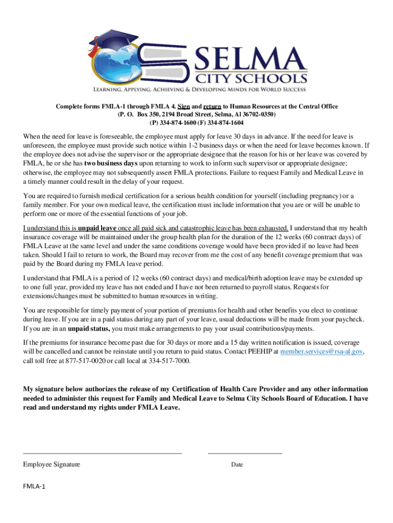 Complete forms FMLA1 through FMLA 4. Sign and return to Human Resources at the Central Office (P. O. Box 350, 2194 Broad Street, Selma, Al 367020350) (P) 3348741600 (F) 3348741604When the need for