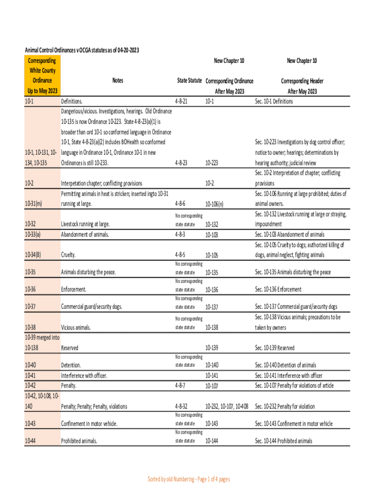 Animal Control Ordinances v OLGA statutes as of 04202023 Corresponding New Chapter 10 White County Ordinance Notes State Statute Corresponding Ordinance Up to May 2023 After May 2023 101 Definitions.