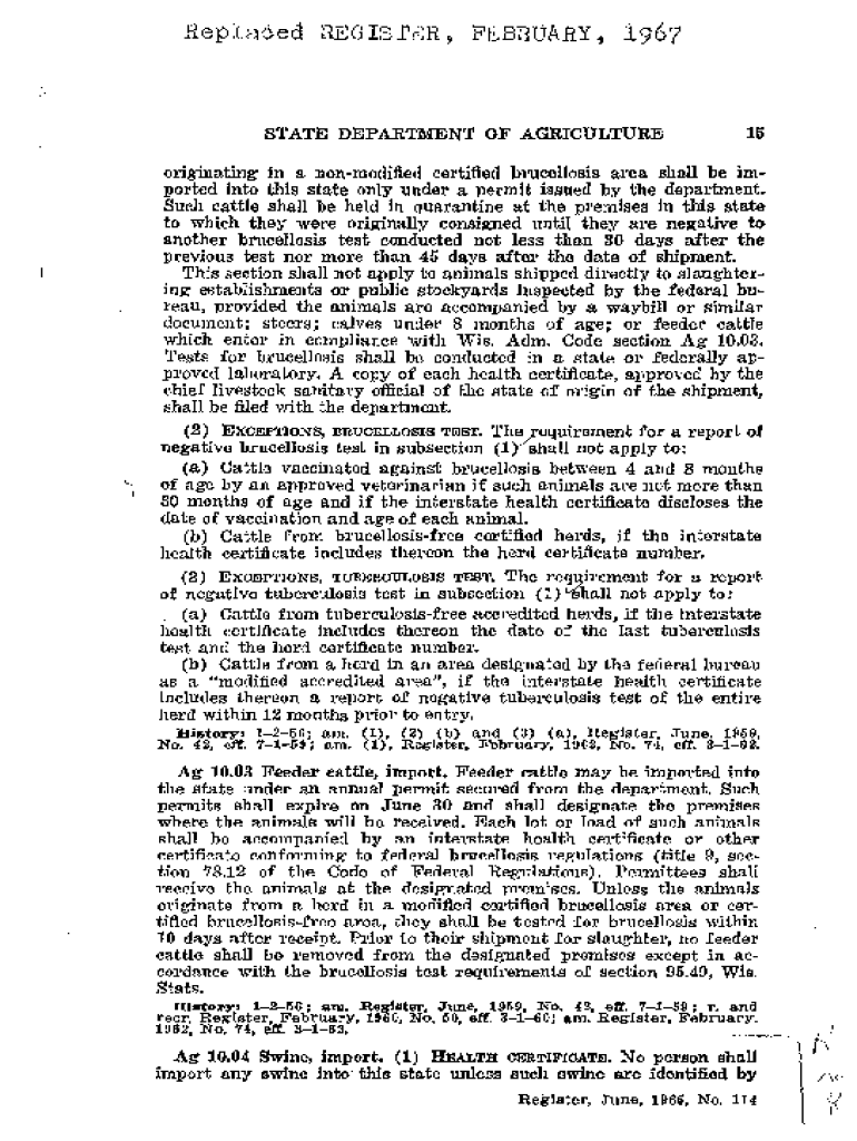 Replaced REGISTER, FEBRUARY, 1967STATE DEPARTMENT OF AGRICULTURE15originating in a nonmodified certified brucellosis area shall be imported into this state only under a permit issued by the department.