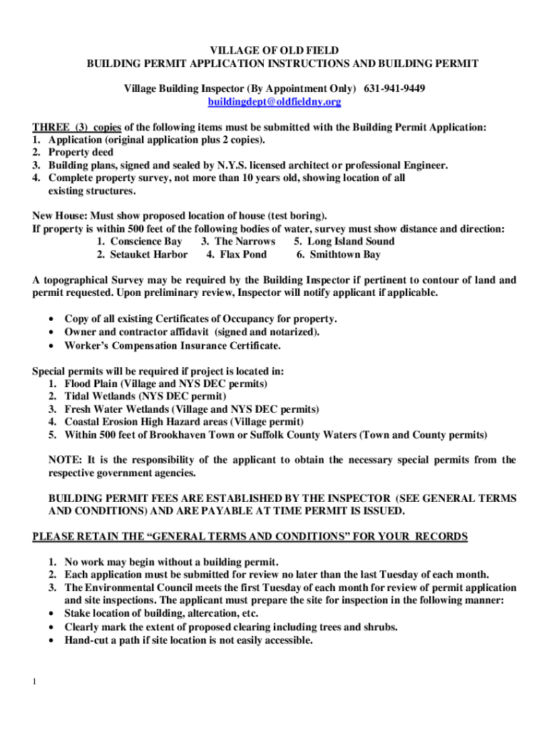 VILLAGE OF OLD FIELD BUILDING PERMIT APPLICATION INSTRUCTIONS AND BUILDING PERMIT Village Building Inspector (By Appointment Only) 6319419449 buildingdept@oldfieldny.org THREE (3) copies of the following