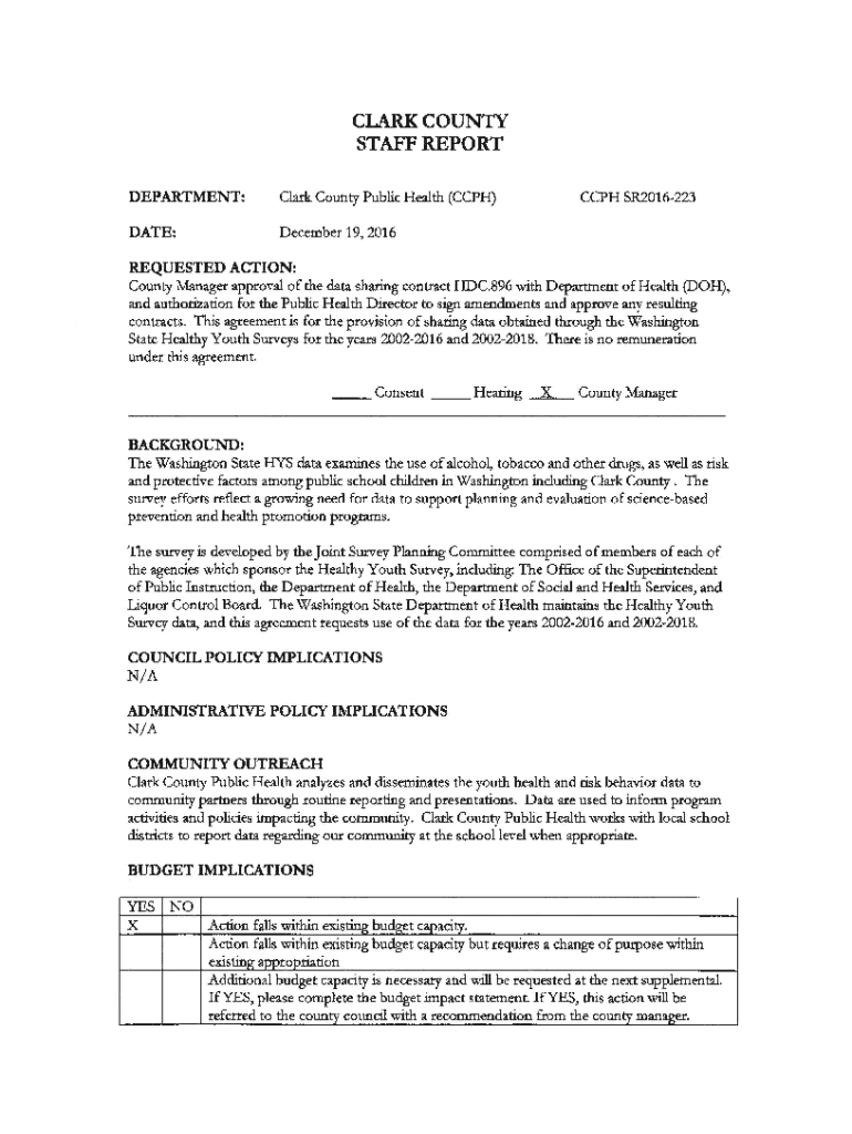 CLARK COUNTY STAFF REPORT DEPARTMENT:Clark County Public Health (CCP)DATE:December 19, 2016CCPH SR2016223REQUESTED ACTION: County Manager approval of the data sharing contract HD.896 with Department