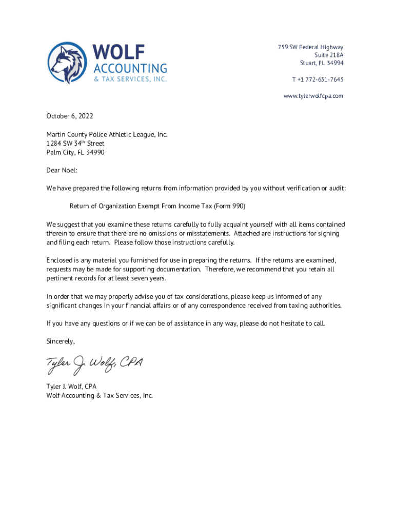 759 SW Federal Highway Suite 218A Stuart, FL 34994 T +1 7726317645 www.tylerwolfcpa.comOctober 6, 2022 Martin County Police Athletic League, Inc. 1284 SW 34th Street Palm City, FL 34990 Dear Noel: