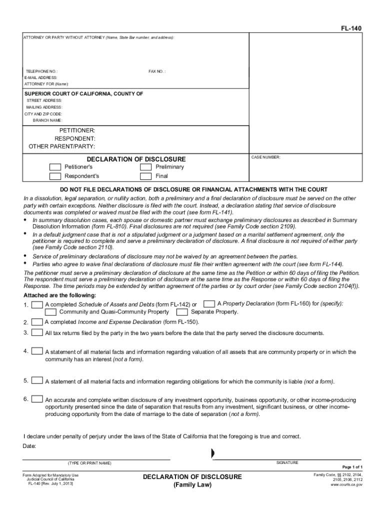 Parties must report detailed information about their income, expenses, assets, and debts on the declaration of disclosure self-help form.