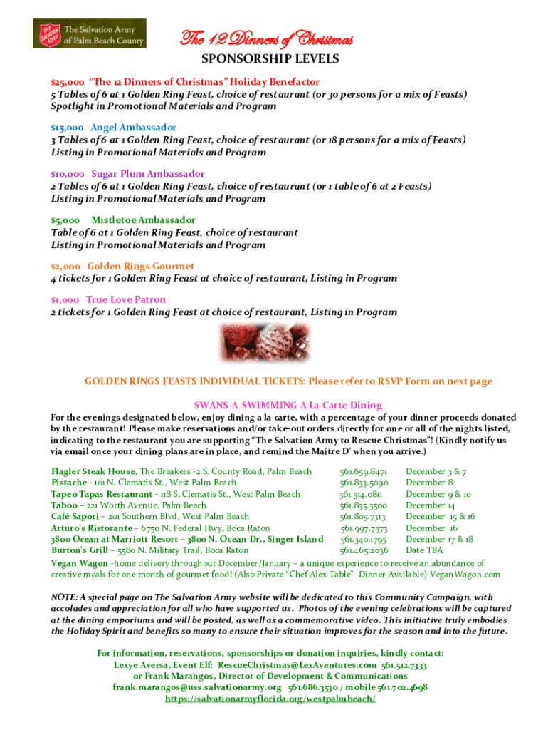 The 12 Dinners of Christmas SPONSORSHIP LEVELS $25,000 The 12 Dinners of Christmas Holiday Benefactor 5 Tables of 6 at 1 Golden Ring Feast, choice of restaurant (or 30 persons for a mix of Feasts)