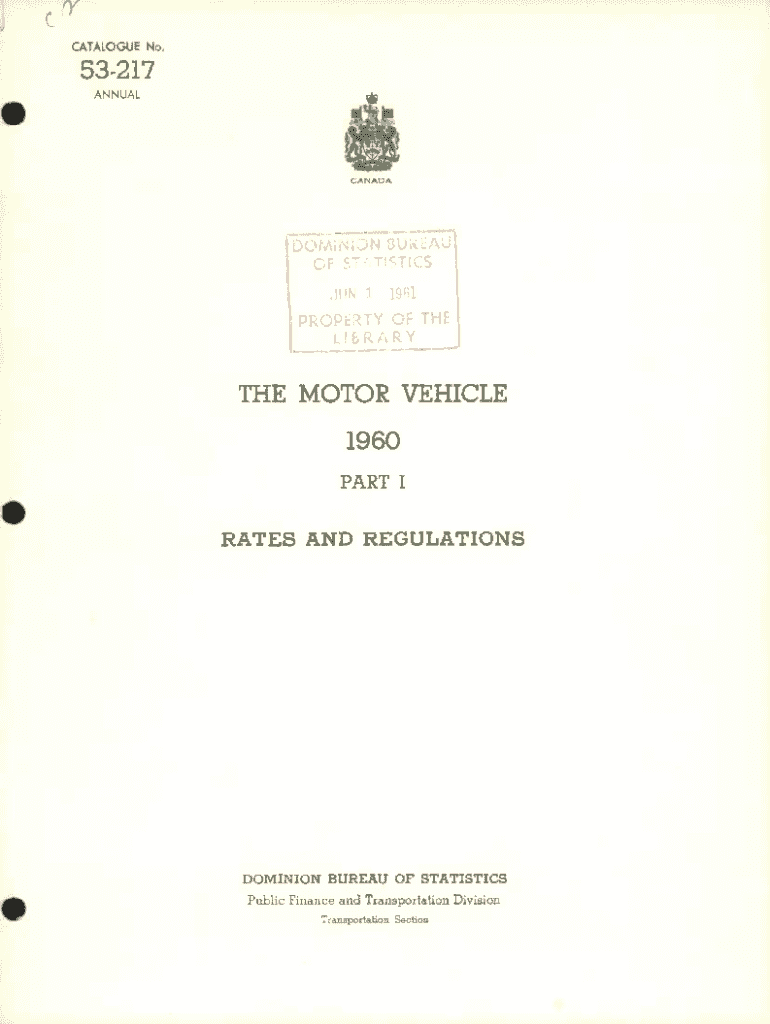 WR Catalog No.53217 ANN4UALDOM\'kin Bureau OF 5TTSTCS JUN 1 191 PROP RTV OF THE L!IRATE MOTOR VEHICLE 1960 PART I RATES AND REGULATIONS.DOMINION BUREAU OF STATISTICS Public Finance and Transportation