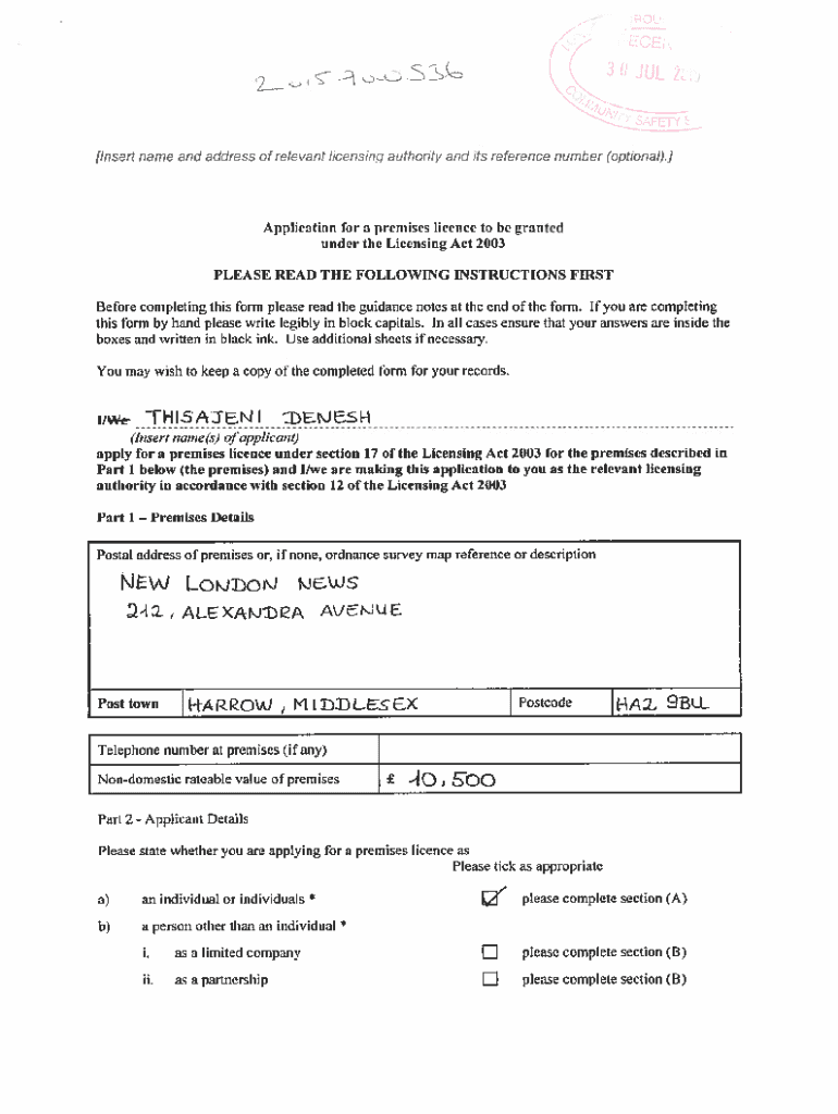 Closed name and address of relevant licensing authority and its reference number (optional).] Application for a premises license to be granted under the Licensing Act 2003 PLEASE READ THE FOLLOW[NG