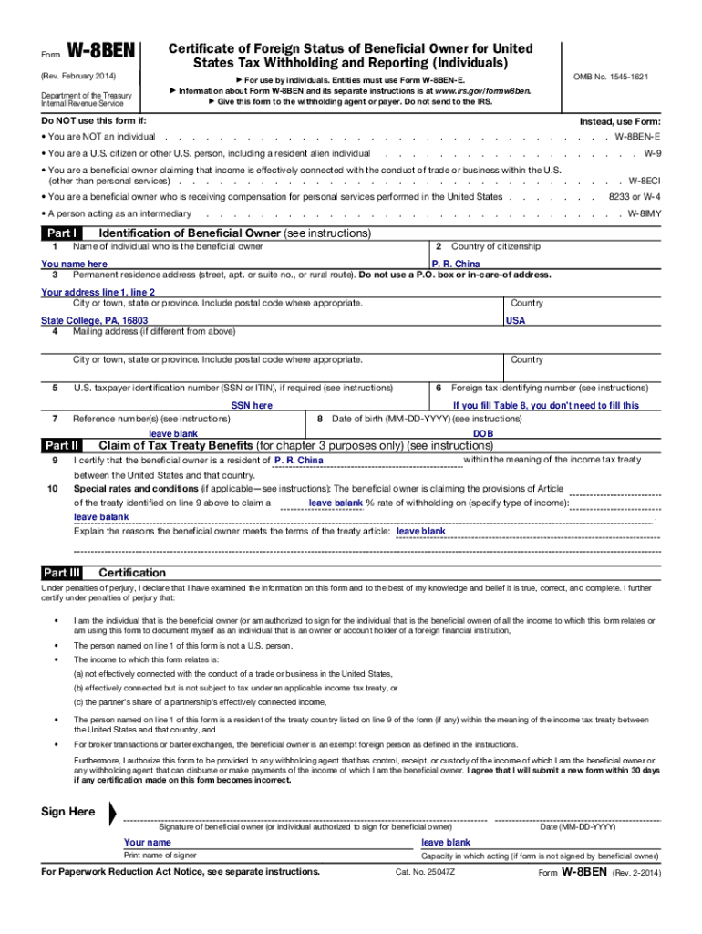 FormW8BENCertificate of Foreign Status of Beneficial Owner for United States Tax Withholding and Reporting (Individuals)(Rev. February 2014) Department of the Treasury Internal Revenue Service OMB