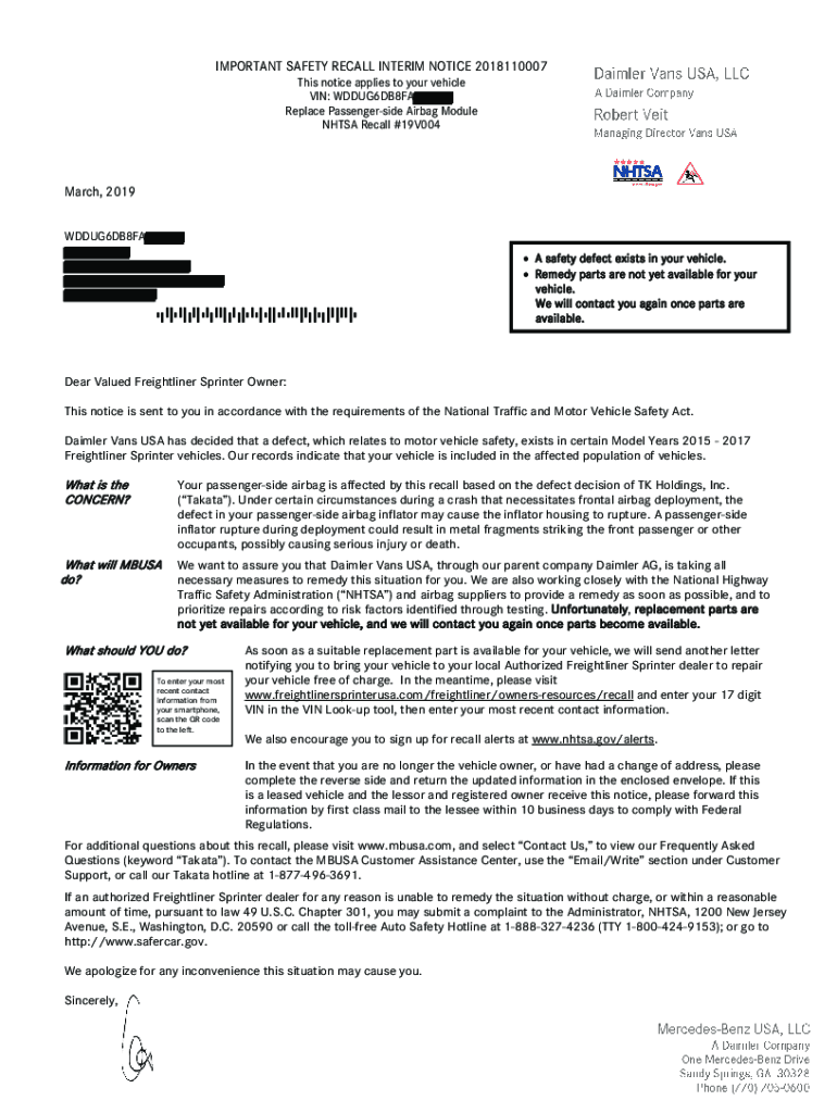 IMPORTANT SAFETY RECALL INTERIM NOTICE 2018110007 This notice applies to your vehicle VIN: WDDUG6DB8FA Replace Passenger side Airbag Module NHTSA Recall #19V004March, 2019 WDDUG6DB8FA A safety defect