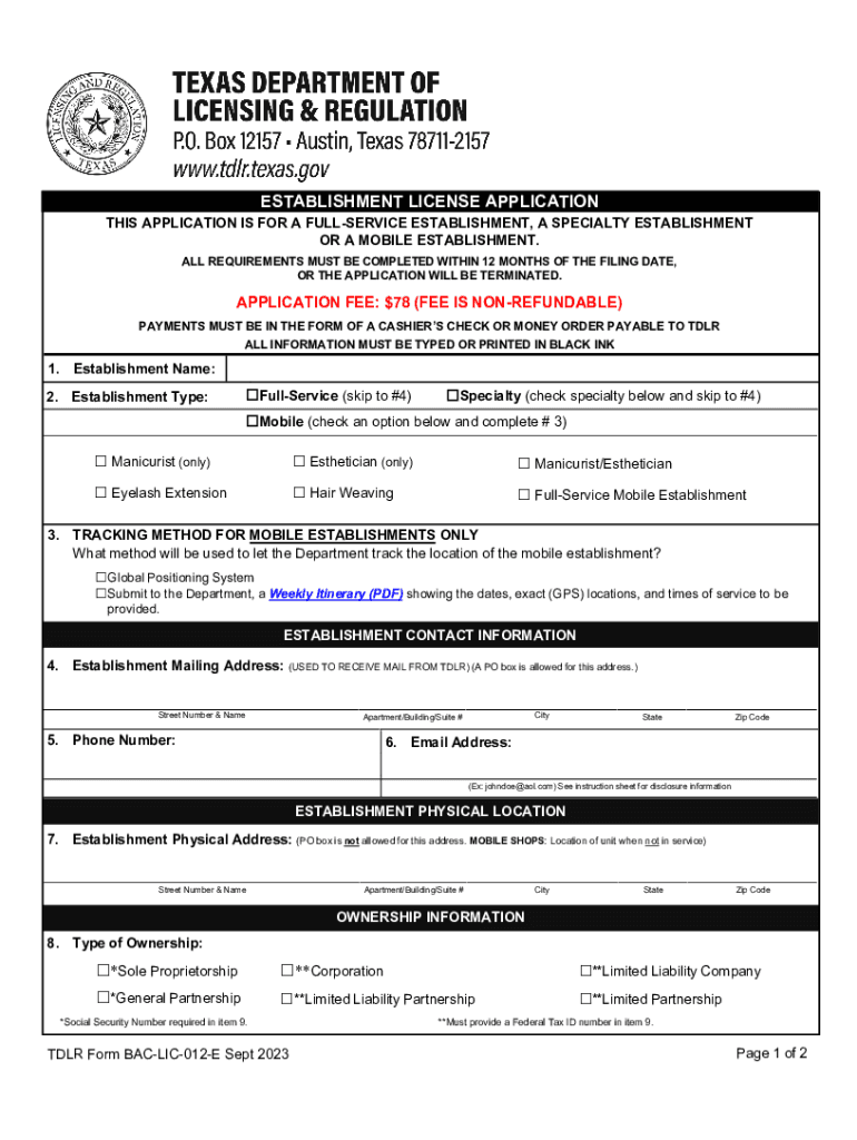 The establishment license application bac-lic-012-e must be filled out completely and accurately with all required information regarding the establishment and its operators.
