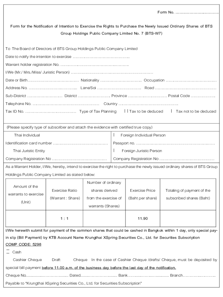 Form No. .... Form for the Notification of Intention to Exercise the Rights to Purchase the Newly Issued Ordinary Shares of BTS Group Holdings Public Company Limited No. 7 (BTSW7) To The Board of