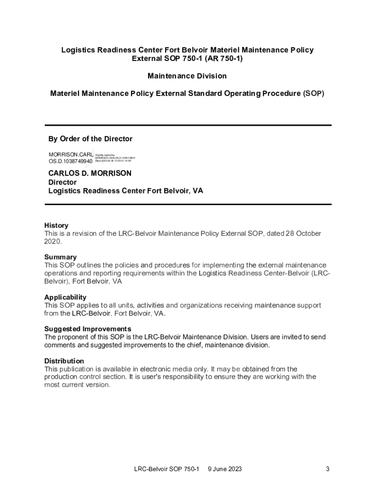 LRCBelvoir SOP 7501Maintenance of Supplies and EquipmentMateriel Maintenance Policy External Standard Operating ProceduresLRCBelvoir Fort Belvoir, VA 9 June 2023SUMMARY of CHANGES LRCBelvoir 7501