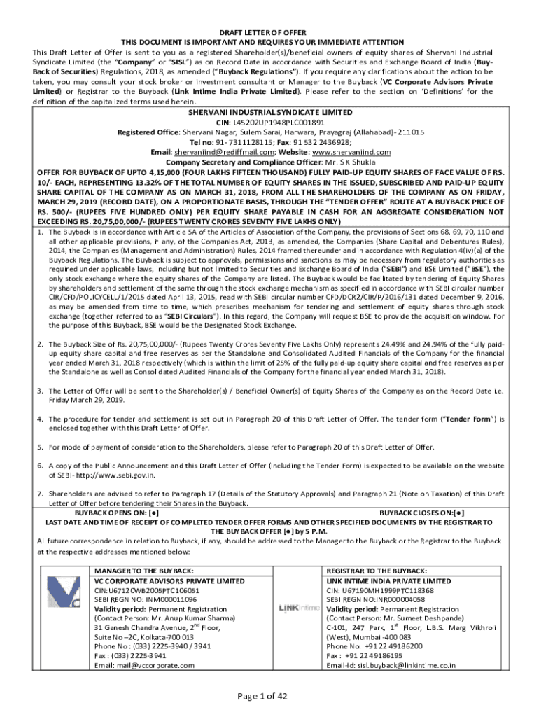 DRAFT LETTER OF OFFER THIS DOCUMENT IS IMPORTANT AND REQUIRES YOUR IMMEDIATE ATTENTION This Draft Letter of Offer is sent to you as a registered Shareholder(s)/beneficial owners of equity shares of