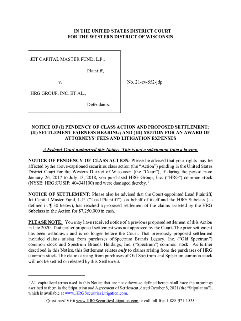 IN THE UNITED STATES DISTRICT COURT FOR THE WESTERN DISTRICT OF WISCONSIN CAPITAL MASTER FUND, L.P., Plaintiff, v. No. 21cv552jdpHRG GROUP, INC. ET AL., Defendants. NOTICE OF (I) PENDENCY OF CLASS