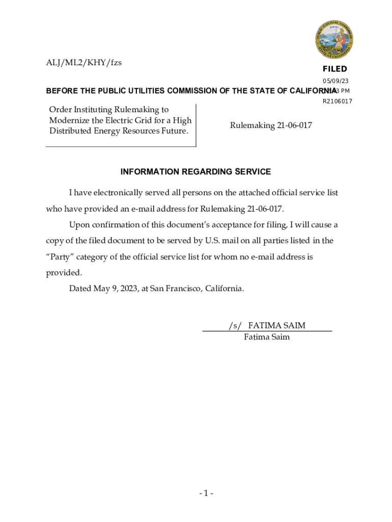 ALJ/ML2/KEY/misfiled 05/09/2312:43 PM BEFORE THE PUBLIC UTILITIES COMMISSION OF THE STATE OF CALIFORNIA R2106017Order Instituting Rule making to Modernize the Electric Grid for a High Distributed