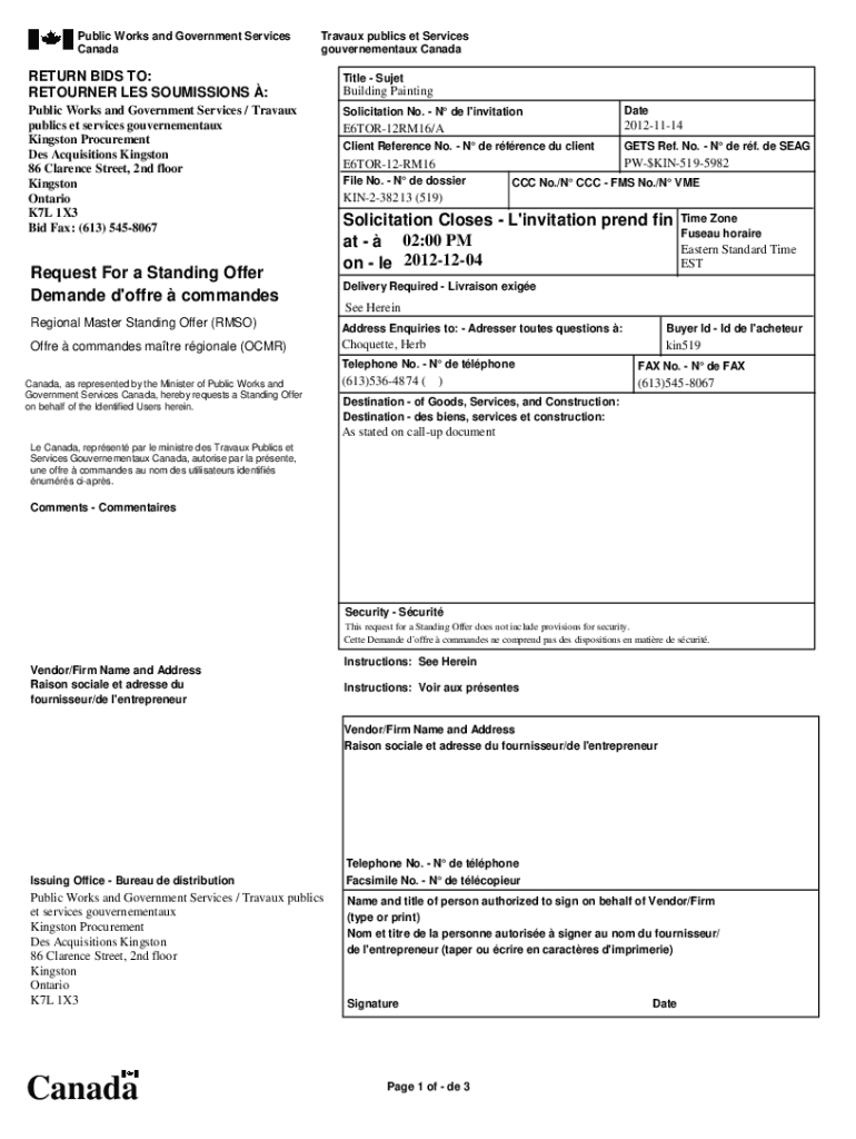 Public Works and Government Services CanadaTravaux public set Services gouvernementaux Canada 1 1RETURN BIDS TO: RETURNER LES COMMISSIONS :Title SujetPublic Works and Government Services / Travail